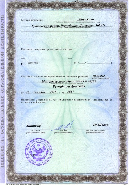 | Адрес местонахождения образовательной организации* | 368203, Республика Дагестан Буйнакский район, с.Карамахи |
